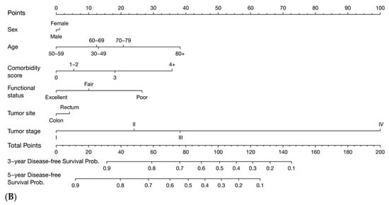 Factors that are consistently and strongly associated with CRC prognosis (e.g., hazard ratio ≥ 2.00 for all-cause mortality) independent of stage include age [], comorbidities [], and functional status [,,]. Chemotherapy is also strongly associated with CRC prognosis but mostly in stage III/IV patients only []. Associations of lifestyle factors such as smoking and physical activity with CRC prognosis are only modest and most likely explained by comorbidity and functional status. We, therefore, selected age, comorbidities, functional status, and tumor stage a priori for our analyses, in addition to sex and tumor location. Our aim was to develop nomograms from parsimonious models that incorporate relevant and easily accessible variables only, as appropriate to prevent over-fitted models [].