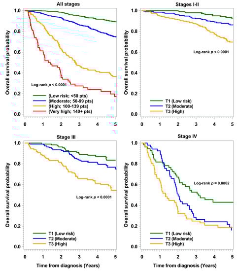 We compared the nomograms’ predictive accuracy with the basic and medium models, using Harrell’s concordance index (C-index) in both the training and validation sets. For patients of all stages, we used restricted cubic spline functions and the Akaike information criterion value to choose appropriate cut offs for risk stratification of patients for OS in the training set. The cut-offs were then applied to the internal validation set. Patients were classified into four nomo-risk groups based on their nomogram points, namely, low (<50 points), moderate (50–99 points), high (100–139 points), and very high risk (140+ points). In the internal validation set, risk stratification for OS by the nomogram was additionally illustrated by Kaplan–Meier survival curves and log-rank tests for trend for the four nomo-risk groups among patients in all stages combined and for tertiles of nomo-risk groups in stage-specific analyses. We, furthermore, calibrated the nomograms in 200 bootstrapped samples, by plotting the observed survival probabilities estimated by the Kaplan–Meier method against the nomogram-predicted survival probabilities.