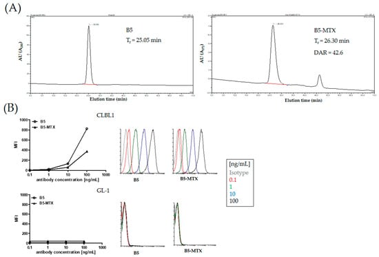 Here, we extend these studies and report on the generation and pre-clinical testing of the novel B5 ADC with methotrexate (B5-MTX). Methotrexate (MTX) is an inexpensive and pharmacologically well-characterized antimetabolite drug [20]. Canine lymphoma cell lines were found to be 10 times more sensitive to MTX (IC50 values of 2–3 nM) than the human Raji B cell lymphoma and Jurkat T-ALL cell lines [21]. At high doses, MTX is still used in combination with rituximab to treat Burkitt’s lymphoma and primary mediastinal B-cell lymphoma [22]. Conjugation of mAbs with MTX changes their mode of entry to target cells [23]. It has been shown in several studies that the MTX payload increases the rate of tumor cell inhibition due to rapid conjugate uptake and an increase in sensitivity to direct cytotoxic effects of therapeutic mAbs [23]. We hypothesized that conjugating mAb B5 with MTX can exert an additive effect of both components and contribute to a better cytotoxicity profile of this ADC against CBL.