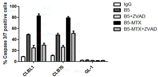 Together, these data indicated that both B5 and B5-MTX displayed a potent caspase-dependent anti-tumor activity against the CLBL1 and CLB70 cell lines, but not against the GL-1 line in vitro. The MTX payload carried by the B5-MTX conjugate enhanced the specific cytotoxicity compared to B5 alone. The ability of a pan-caspase inhibitor, ZVAD, to strongly interfere with B5- and B5-MTX-induced cell killing supported the caspase-dependent mechanism.