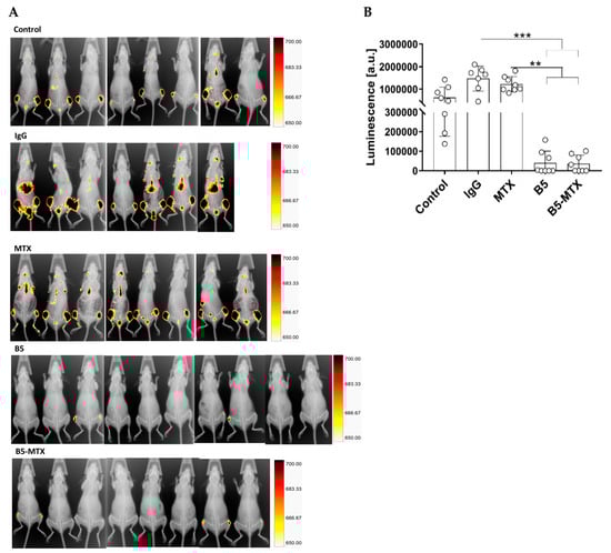 In vivo imaging and quantification of bioluminescence in CLBL1-Luc tumor-bearing mice on day 15 after tumor cell transplantation. (A) Control mice were infused with phosphate-buffered saline (Control), isotype-matched mouse IgG immunoglobulin (IgG), free methotrexate (MTX) or were treated with mAb B5 and B5-MTX. Bioluminescence intensity is presented on pseudo-color scales. (†) The IgG group contained seven mice because one mouse was found dead on the day preceding bioluminescence imaging (B) Individual bioluminescence intensities of each mouse were plotted. Statistically significant differences between the groups were marked with an asterisk (*** p < 0.001, ** p < 0.01).