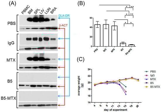 Analysis of tumor cell spread and body weight loss in CLBL-Luc tumor-bearing mice. (A) Protein lysates were obtained from the following organs/tissues of tumor-bearing mice: peripheral blood mononuclear cells (PBMC), bone marrow (BM), spleen (SPL), liver (LIV), lung (LUN), brain (BRA). Admixture of CLBL1-Luc cells in the above organs/tissues, reflecting tumor burden, was evaluated by Western blotting with anti-DLA-DR antibody. Protein loading was controlled with an anti-beta actin antibody (β-ACT) (B) Cell suspensions of bone marrows were prepared from mice treated with PBS (n = 8), IgG (n = 7), MTX (n = 8), B5 (n = 5) and B5-MTX (n = 5) and assessed for CLBL1-Luc cell content by flow cytometry with an anti-DLA-DR antibody, E11. (C) The average body weights of mice from the indicated experimental groups (n = 8 mice per group except for B5, n = 10 mice per group) were plotted. Statistically significant differences between the groups were marked with an asterisk (*** p < 0.001, ** p < 0.01).