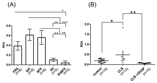 Assessment of soluble DLA-DR levels in blood sera of tumor-bearing NOD-SCID mice (A) and healthy dogs or canine lymphoma patients (B). Average serum levels (Abs) of DLA-DR in mice in the indicated experimental groups and healthy (control) or diseased dogs upon admission to the veterinary clinic (CBL) or after chemotherapy (CLB + CHOP) were plotted. Statistically significant differences between the groups were marked with asterisk * p < 0.05, ** p < 0.01, *** p < 0.001.
