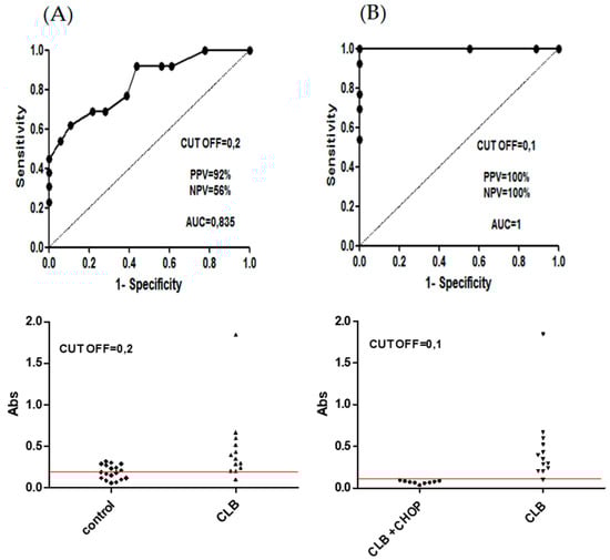 Evaluation of the diagnostic potential of soluble DLA-DR levels in canine CBL patients versus healthy control dogs (A), and in CBL patients versus post-chemotherapy patients (B). Receiver operating characteristics analysis was used to determine sensitivity, specificity, positive predictive value (PPV), negative predictive value (NPV), area under the curve (AUC) value and cut off (CUT OFF) value for the soluble DLA-DR immunoassay.