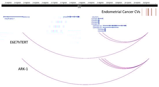 Promoter-associated chromatin looping identifies HiChIP target genes at the 9p21.3 locus. Promoter-associated loops were intersected with endometrial cancer risk CVs (coloured red), revealing loops (purple) that interact with the promoters of MIR31HG (in E6E7hTERT and ARK-1 cells), CDKN2A (in E6E7hTERT and ARK-1 cells), CDNK2B-AS1 (in E6E7hTERT and ARK-1 cells) and CDKN2B (in ARK-1 cells). CDK2NA and the non-coding anti-sense gene CDKN2B-AS1 are encoded on opposite DNA strands and share a promoter.