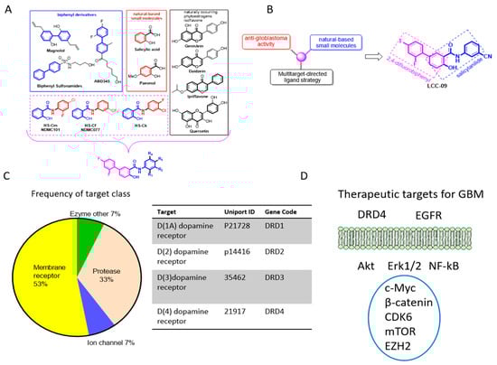 The design, synthesis, and functional characterization of the novel multi-target small molecule dopamine antagonist, LCC-09. Schema showing (A) several novel series of 5-(2′,4′-difluorophenyl)-salicylanilide derivatives based on difluorobiphenyl and salicylanilide scaffolds, and (B) the pharmacological rationale for the synthesis of LCC-09, consisting of 2,4-difluorophenyl and paeonol moiety of salicylate. (C) Pie-chart showing computer-assisted predicted targets of LCC-09 and the target class frequency (left panel), and a list of predicted LCC-09-targeted dopamine receptors DRD1, DRD2, DRD3, and DRD4 (right panel). (D) A schema of LCC-09-relevant therapeutic targets of glioblastoma (GBM).
