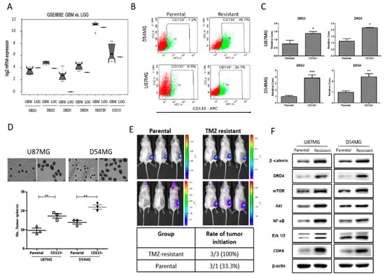 Based on the results of our preliminary computer-assisted chemical fingerprinting for the structural and functional characterization, which suggested the pharmacological targetability of DRDs by LCC-09, we evaluated the expression profile of DRDs in the clinical samples from patients with high grade GBM or low grade glioma (LGG) by accessing and statistically analyzing the Gene Expression Omnibus (GEO) GSE8692/GPL96 dataset (n = 12, 22,283 probes) (https://www.ncbi.nlm.nih.gov/gds/?term=GSE8692). Our results showed that while no difference was observed between the expression of DRD1 in the high grade GBM and LGG, the GBM group had higher expression level of DRD2, DRD3, and DRD4 mRNA compared to the LGG group, and this expression profile positively correlated with that of GSC markers, Nestin, and CD133 (Figure 2A). Against the background that CD133 and Nestin are broadly implicated in the resistance of GBM cells to TMZ treatment [,], using the established TMZ-resistant U87MG and D54MG cells, we showed that relative to their parental counterparts, CD133 positivity was enhanced 4.02- and 6.35-fold in the TMZ-resistant U87MG and D54MG cells, respectively (Figure 2B). We also demonstrated that the observed increased CD133 positivity in the TMZ-resistant cells was positively correlated with concurrent enhanced expression of DRD2 (U87MG: p < 0.01; D54MG: p < 0.001) and DRD4 (U87MG: p < 0.01; D54MG: p < 0.01) (Figure 2C). In addition, the CD133+ TMZ-resistant cells generated a significantly higher number of neurospheres, compared to their parental U87MG (~38% increase, p < 0.01) and D54MG (~27% increase, p < 0.01) cells (Figure 2D). Furthermore, in a bid to delineate the association between TMZ-resistance, CD133 positivity, and DRD4 expression, using the xenograft murine GBM models, we demonstrated that compared to the 33.3% (n = 3) tumorigenicity observed in litter-mates inoculated with parental U87MG cells, all the mice (n = 3) inoculated with CD133+ TMZ-resistant cells recorded tumor formation by day 21 (Figure 2E). More interestingly, using Western blot analyses, we showed that this enhanced tumorigenicity was associated with concurrently upregulated expression of DRD4, β-catenin, Akt, mTOR, NF-κB, Erk1/2, p-Erk1/2, and CDK6 (Figure 2F, see also Supplementary Figure S3). These data, at least in part, indicate the existence of a positive correlation between CD133 positivity and DRD4 expression, as well as a probable functional association between the duo and resistance to TMZ in GBM.