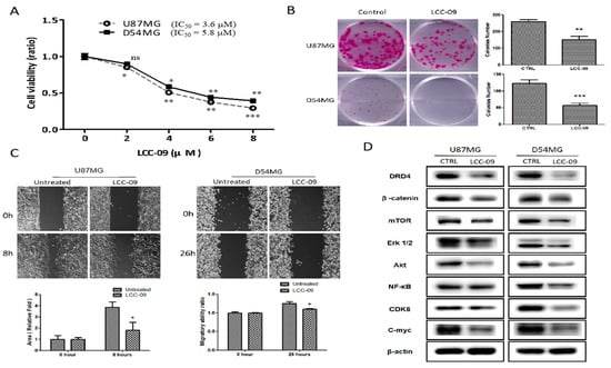 LCC-09 suppressed the viability and metastatic phenotype of GBM cells through the dysregulation of DRD4-mediated AKT/mTOR and NF-κB signaling axes. (A) LCC-09 significantly suppressed the viability of TMZ-resistant CD133+ U87MG and D54MG cells in a dose-dependent manner. Photo-images and graphical representation of the inhibitory effect of LCC-09 on the ability of TMZ-resistant CD133+ U87MG and D54MG cells to (B) form colonies, and (C) migrate. (D) LCC-09 downregulates the expression level of DRD4, β-catenin, Akt, mTOR, NF-κB, Erk1/2, c-Myc, and CDK6 proteins in TMZ-resistant CD133+ U87MG and D54MG cells compared to their vehicle-treated counterparts. β-actin served as loading control. * p < 0.05, ** p < 0.01, *** p < 0.001; ns, not significant; Data represent the mean ± SD of experiments performed 4 times in triplicates.