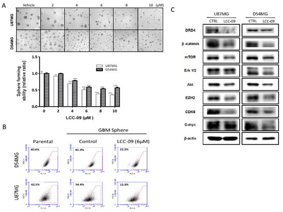 GSCs are characterized by enhanced proliferative, metastatic, and drug-resistant traits, as well as high clonogenicity and neurosphere formation efficiency compared to other cells in the tumor niche [,,]; we further evaluated the effect of LCC-09 on these GSC-like phenotypes of the CD133+ TMZ-resistant U87MG or D54MG cells. Using the neurosphere formation assay, we demonstrated that the treatment of these TMZ-resistant cells with 2–10 μM LCC-09 for 24 h inhibited the formation of neurospheres, dose-dependently, with 24 h exposure to 8 μM eliciting a 73% (p < 0.001) or 49% (p < 0.001) reduction in number of neurospheres formed by the U87MG or D54MG cells, compared to their vehicle-treated counterparts (Figure 4A). Understanding that ALDH activity, which is a marker of cancer stemness, is also implicated in metastasis, therapy failure, and poor prognosis [], we demonstrated that compared to the parental or vehicle-treated neurospheres, 6 μM LCC-09 suppressed ALDH activity in the D54MG neurospheres by 34.4% or 59.1%, respectively; while in the U87MG neurospheres, it elicited a 30.2% or 42.1% reduction, respectively (Figure 4B). Consistent with earlier results, the observed LCC-09-mediated suppression of neurosphere formation efficiency and ALDH activity was associated with concurrent downregulation of DRD4, β-catenin, Akt, mTOR, Erk1/2, p-Erk1/2, EZH2, c-Myc, and CDK6 protein expression levels in the ALDHhi neurospheres (Figure 4C, also see Supplementary Figure S3). These data indicate that by targeting dopaminergic signals and ALDH activity, LCC-09 effectively induces attenuation of the stem cell-like phenotype of GBM cells.