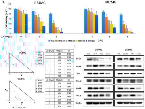 Since TMZ-resistance is the Achilles’ heel of the therapy of choice for patients with GBM [,,], and having shown that LCC-09 exhibits significant anti-GSC effects, we thus examined if LCC-09 could be combined with TMZ, and the effect of such combination on the anticancer activity of the latter. Results of our cytotoxicity assay show that treatment with 1–2 μM LCC-09 alone or combined with 200–500 μM TMZ sequentially, reduced the viability of the D54MG or U87MG cells, and significantly enhanced the anticancer effect of TMZ on the cells in a dose-dependent manner (Figure 5A). Using the Chou–Talalay-based algorithm for drug combination analyses, we observed that all drug combination points were located within the right-angle isobologram triangle and that all CI values were <1, thus, demonstrating that the combined effect of LCC-09 and TMZ against the D54MG or U87MG cells was synergistic (Figure 5B). Compared with the expression levels when treated with TMZ or LCC-09 alone, TMZ/LCC-09 combination therapy significantly downregulated the expression level of DRD4, Akt, mTOR, Erk1/2, p-Erk1/2, CDK4, and CDK6 (Figure 5C, also see Supplementary Figure S3). These data indicate that LCC-09 synergistically enhances the anticancer efficacy of TMZ in GBM cells.