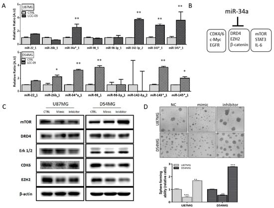 The last decade has been characterized by increasing documentation of the critical role of microRNAs (miRNAs, miRs) in the regulation of GSC activity, including disease progression, therapy failure, and poor prognosis [,]. Thus, we evaluated the effect of 24 h exposure of CD133+ALDHhiDRD4+ TMZ-resistant D54MG or U87MG cells to 6 μM LCC-09 on a small panel of carefully curated miRs. Results of our RT-PCR demonstrated that only miR-34a and miR-143/145 cluster mRNA levels were significantly elevated in both the U87MG and D54MG cells (Figure 6A), suggesting, in part, a potential common regulatory mechanism. Since miR-34a suppresses the proliferation and growth of GSCs by targeting multiple SC-associated oncogenic signaling cascades [,] including those relevant to the present study as illustrated (Figure 6B), to better understand this LCC-09-induced epigenetic modulation of GBM cells we examined the effect of altered miR-34a expression on GBM cells using miR-34a mimic or inhibitor. Our results indicate that transfection with miR-34a mimic resulted in the suppression of mTOR, DRD4, Erk1/2, CDK6, and EZH2 in the D54MG or U87MG cells. Conversely, transfection with miR-34a inhibitor enhanced the expression of mTOR, DRD4, Erk1/2, CDK6, and EZH2 proteins (Figure 6C). In similar experiments performed under serum-deprived conditions, we observed that GBM cells transfected with miR-34a mimic significantly lost the ability to form neurospheres while those bearing the miR-34a inhibitor exhibited enhanced ability to form neurospheres (Figure 6D).