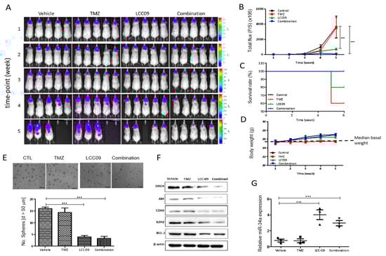 LCC-09 significantly suppresses GSC-related oncogenic and dopaminergic signals by up-regulating miR-34a in GBM cells, in vivo. (A) Bioluminescence imaging of the effect of LCC-09 on tumor burden from week 1 to week 5, and (B) semi-quantitative analysis of bioluminescence total flux (photons/s) of the tumor burden in mice inoculated with luciferase-expressing TMZ-resistant CD133+ U87MG cells, in comparison to treatment with vehicle. The differential effect of LCC-09 and/or TMZ, on (C) the survival, using the Kaplan–Meier plot, and (D) body weight of treated mice, compared to those in the control group. (E) Photo-images of the effect of LCC-09 and/or TMZ on the neurosphere-forming capability of the cells from tumor samples harvested from the treated mice, compared to the control group. (F) The effect of LCC-09 on the expression of DRD4, ERK1/2, EZH2, and CDK6 in tissue samples from mice inoculated with luciferase-expressing TMZ-resistant CD133+ U87MG cells, in comparison to treatment with vehicle. (G) Graphical representation of the relative miR-34a expression level in mice inoculated with luciferase-tagged TMZ-resistant CD133+ U87MG cells and treated with LCC-09 or vehicle. P/S, photon/s; * p < 0.05, ** p < 0.01, *** p < 0.001; data represent the mean ± SD of experiments performed at 4 times in triplicates.