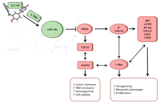 Schematic abstract depicting how the novel multi-targeted small molecule, LCC-09 inhibits the stemness, oncogenic and therapy-resistant phenotypes of glioblastoma cells by increasing miR-34a and deregulating the DRD4/Akt/mTOR signaling axis.