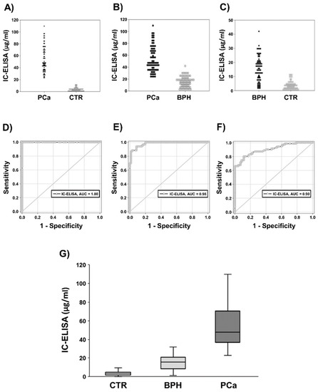 Figure 1 shows the values distribution in PCa vs. CTR (Figure 1A), PCa vs. BPH (Figure 1B), and BPH vs. CTR (Figure 1C). The performance of IC-ELISA was further evaluated with receiving operating characteristics (ROC) analysis (Figure 1D–F). The data showed 100% sensitivity and specificity comparing: (1) PCa vs. CTR (Figure 1D)—AUC: 1.00, p < 0.001; Cut-off: µg/mL Exo-PSA = 17.07; (2) PCa vs. BPH: 98.57 sensitivity and 80.28% specificity (Figure 1E)—AUC: 0.98, p < 0.001; Cut-off: µg/mL Exo-PSA = 23.32; (3) BPH vs. CTR: 98.57 sensitivity and 80.28% specificity (Figure 1F)—AUC: 0.90, p < 0.001; Cut-off: µg/mL Exo-PSA = 23.32.