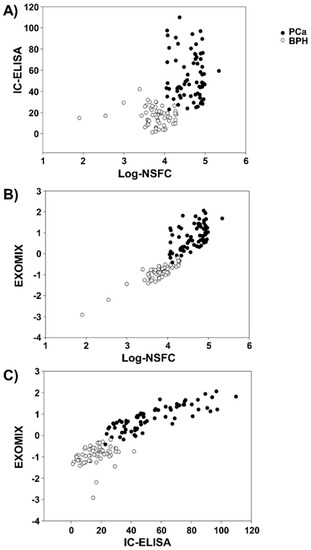 The following are available online at https://www.mdpi.com/2072-6694/11/10/1449/s1, Figure S1. Quality control for the exosome preparations by NTA and protein characterization by western blot analysis for housekeeping markers of exosomes, Table S1: Descriptive statistics together with the pairwise Pearson correlation coefficients between the different biomarkers (S-PSA, IC-ELISA, Log-NSFC), Table S2: Projection (component scores) of the patients in the bi-dimensional space spanned by the two principal components, Table S3: Projection (component scores) of the patients in the bi-dimensional space spanned by the two principal components and, by construction, correspond to a rotation of the Log-NSFC/IC-ELISA space explaining the total initial information. This has been provided by the authors to give readers additional information about their work.
