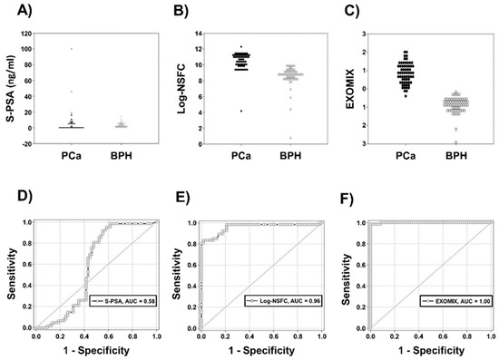 Distribution and ROC curve of S-PSA, Log-NSFC and EXOMIX for the discrimination between PCa and BPH. (A) Distribution of S-PSA. (B) Distribution of Log-NSFC. (C) Distribution of EXOMIX. (D) ROC curve of S-PSA. (E) ROC curve of Log-NSFC. (F) ROC curve of EXOMIX.