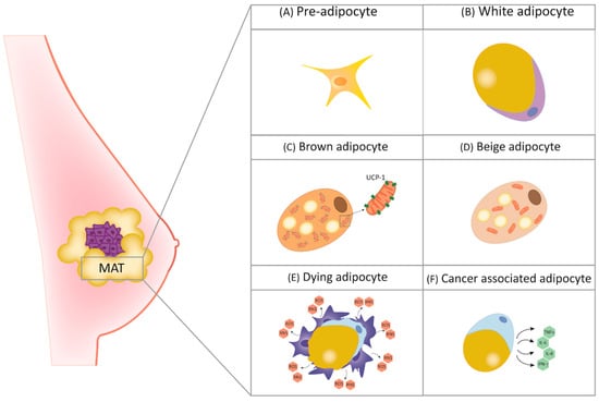 Typical mammary adipose tissue (MAT) cellular composition. (A) Pre-adipocytes, immature precursor of mature adipocytes; (B) white adipocytes, with lipid-storage and endocrine functions, contain single lipid droplet occupies the largest part of the cytoplasm; (C) brown adipocytes, containing several cytoplasmic small fatty droplets and mitochondria, with uncoupling protein 1 (UCP1)-dependent thermoregulatory functions; (D) beige adipocytes, with UCP1-independent thermoregulatory functions; (E) dying adipocytes, form crown-like structures due to macrophage recruitment, causing the release of reactive nitrogen species (RNS) and reactive oxygen species (ROS); (F) cancer-associated adipocytes, with unbalanced production of pro-inflammatory cytokines.