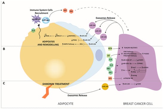 (A) After co-culture between adipocytes and breast cancer (BC) cells, high levels of miR-144 and miR-126 were released by exosomes by BC cells. This miRs delivery leads to final adipolysis and remodeling of adipose tissue driven by miR-144 through the downregulation of Mitogen-Activated Protein Kinase Kinase Kinase 8/Mitogen-Activated Protein Kinase 3/1/Peroxisome Proliferator Activated Receptor Gamma (MAPK3/ERK1/2/ pPPARγ) and by miR-126 through the Protein Kinase AMP-Activated Catalytic Subunit Alpha 1 (AMPK)/ autophagy pathway, causing adipocyte-induced tumor growth [77]. BC-derived exosomes after adipocytes interaction carry a higher level of miR-155, which promotes adipocytes differentiation and remodeling in surrounding adipocytes targeting pPPARγ, thus facilitating tumor progression [76]. Increased adipocyte-derived interleukin-8 (IL-8) is responsible for neutrophils and macrophages recruitment, leading to the production of Reactive Oxygen Species (ROS) and Reactive Nitrogen Species (RNS), which act as a threat to tumor initiation. (B) Interaction of adipocytes with BC cells increase the release of proinflammatory cytokines and chemokines, leading to an upregulation of miR-3184-5p and downregulation of miR-181c-3p in BC cells, with the modulation of their respective target genes, forkhead box P4 (FOXP4) and PPARα; increased release of adipocyte-derived proinflammatory cytokines and adipokins such as leptin (LEP), IL-6, IL-8 and tumor necrosis factor alpha (TNFα) is responsible for the induction of janus kinase/signal transducers and activators of transcription (JAK/STAT) and through phosphoinositide 3-kinase/protein kinase B (PIK3/AKT) pathways. Resistin (RETN) promotes BC progression through the Toll like receptor 4/nuclear factor kappa-light-chain-enhancer of activated B cells/ signal transducer and activator of transcription 3 (TLR4/ NF-κB /STAT3) axis. As a result, EMT, migration and invasion pathways are enhanced in BC cells [72]. Likewise, after adipocytes and BC cells co-culture, there is an increase of proinflammatory cytokines secretion, with an activation of Src that upregulates SRY-Box transcription factor 2 (SOX2), cMYC and Nanog. SOX2 induces miR-302b transcription that, in turn, further stimulates cMYC and SOX2 expression, increasing the cytokine-induced cancer stem cell-like properties [73]. Conversely, adiponectin (APN) has anti-tumoral properties by inhibiting mammalian target of rapamycin (mTOR) and NF-κB pathways. (C) Treatment with the anti-tumor compound shikonin (SK). SK-treated adipocytes release high levels of miR-140, which block tumor progression of co-cultured BC cells targeting SOX9 signaling [74].