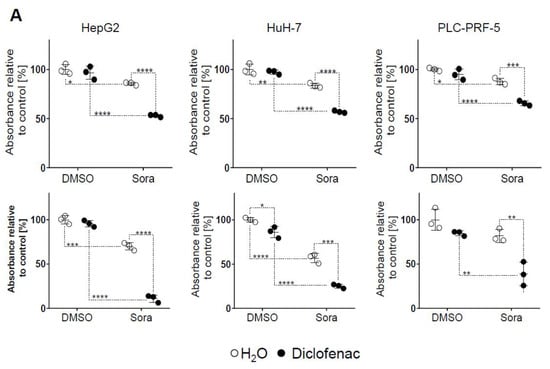 Effect of sorafenib and diclofenac on hepatocellular carcinoma (HCC) cell growth. (A) MTS proliferation assay of HepG2, Huh-7, and PLC-PRF-5 cell lines treated for 24 h (upper panels) or 48 h (lower panels) with sorafenib (Sora, 5 μM), diclofenac (100 μM), sorafenib and diclofenac, or dimethyl sulfoxide (DMSO) as a control for sorafenib and H2O for diclofenac. Each dot represents the mean of a separate experiment run in triplicates. The mean of the control group (DMSO/H2O) was fixed at 100%. (B) Photographs (5×) of HepG2, Huh-7, and PLC-PRF-5 subjected to sorafenib (Sora, 5 μM), diclofenac (100 μM), sorafenib and diclofenac, or DMSO and H2O treatments for 24 h. (C) HCC cells were treated with sorafenib (5 μM), diclofenac (Diclo, 100 μM), sorafenib and diclofenac, or DMSO or H2O as controls. After 24 h of treatment, cells were collected and processed for cell cycle analysis. Mean DNA content profiles of three independent experiments are shown. p value: * < 0.05, ** < 0.01, *** < 0.001, **** < 0.0001, two-way ANOVA with Sidak’s multiple comparisons test. For panel (c), p values were determined for the hypodiploid fractions.
