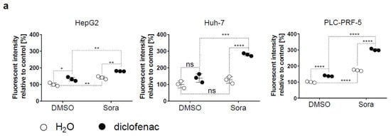 Cancer cells were plated in 96-well plates with 1 × 105 cells per well. After 24 h, cells were treated with the indicated concentrations of diclofenac, sorafenib, or diclofenac and sorafenib, or DMSO/water as vehicle controls, for 5 h. An ROS assay stain was subsequently added following the manufacturer’s instructions (Total Reactive Oxygen Species Assay Kit 520 nm (Invitrogen, Carisbad, CA, USA, ref. 88-5930-74) and incubated at 37 °C for 1 h. Total ROS levels were measured on a fluoroscopic microplate reader at 520 nm. Results are expressed as mean fluorescent intensity relative to control.