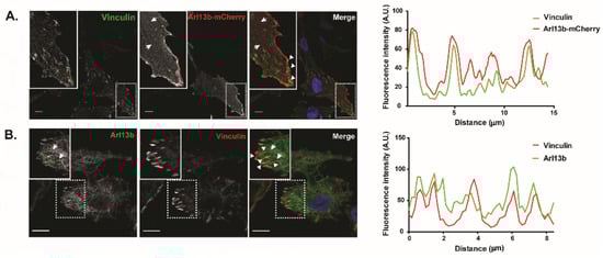 Arl13b has a well-established role in the trafficking of ciliary proteins and ciliogenesis [11,12]. Notably, we reported its interaction with actin through NMIIA, its localization to actin-rich structures [16] and now the interaction of Arl13b with β3-integrin and co-localization with FA components, namely Vinculin and Paxillin. Interestingly, it is now appreciated that many ciliary proteins have other localizations besides primary cilia and that they can play a role in the formation of polarized cellular structures [29]. Furthermore, it was described that FA proteins associate with basal bodies of ciliated cells and form ciliary adhesion complexes that interact with the actin cytoskeleton [30]. Therefore, Arl13b functions in primary cilia and FA dynamics further suggest that primary cilia and FAs might share protein components that are recruited to the appropriate location depending on the cellular context or cell transformation status.