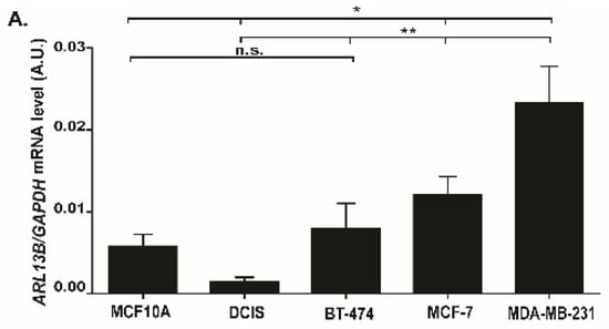 2.5. Arl13b Expression is Upregulated in Breast Cancer Cell Lines and Tissue Samples