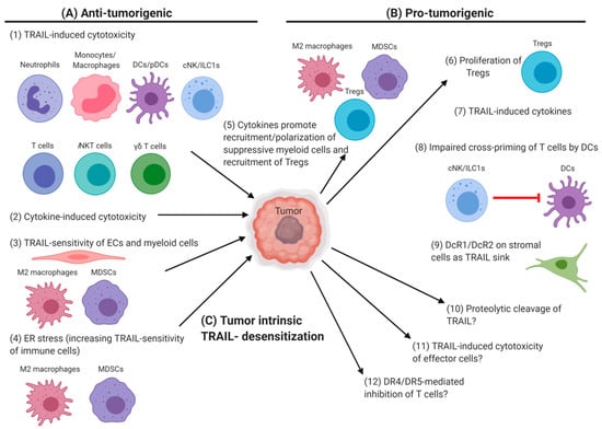 Anti- and pro-tumorigenic activities of TRAIL/DRs in the tumor micro-environment: (A) Anti-tumorigenic activities: (1) Several immune cells have been reported to be cytotoxic against tumor cells in an at least partially TRAIL-dependent manner. (2) Besides TRAIL killing the tumor directly, TRAIL-induced cytokines, like TNF, can be cytotoxic for the tumor as well. (3) Endothelial cells (ECs) in the tumor can become TRAIL-sensitive, potentially leading to blood vessels collapse, causing a disruption of the blood supply for the tumor. Similar, pro-tumorigenic M2 macrophages and MDSCs are known to be sensitive towards TRAIL-induced apoptosis. (4) Although, ER stress inside of the tumor is usually associated with pro-tumorigenic effects [329] it can also have an anti-tumorigenic impact. This is mainly due to the increased TRAIL-sensitivity of anti-inflammatory M2 macrophages and MDSCs. (B) Pro-tumorigenic activities: (5) TRAIL/DR-induced cytokines produced by the tumor can promote the recruitment and polarization of M2 macrophages and MDSCs, and can promote the recruitment of Tregs. (6) For Tregs it was shown that TRAIL-induced triggering of DR4/DR5 on Tregs can promote their proliferation. (7) TRAIL-induced cytokines, either produced by the tumor or immune cells, can promote tumor survival and proliferation directly or indirectly, e.g., by supporting neo-vascularization. (8) Triggering of DR4/DR5 on DCs by TRAIL+ cNK/ILC1s could suppress the cross-priming of tumor-specific T cells by the DCs. (9) Expression of DcR1 and DcR2 on tumor stroma cells can act as sink for TRAIL, reducing its availability to induce tumor cytotoxicity. (10–12) For several other mechanisms, an impact of TRAIL/DRs has not been demonstrated for the tumor microenvironment yet, but their role could be hypothesized based on published data in other contexts. (10) The tumor might promote the proteolytic cleavage of membrane TRAIL from immune cells. (11) TRAIL, either derived from immune cells or from the tumor itself, might promote cytotoxicity of TRAIL-sensitive immune effector cells. (12) TRAIL-mediated triggering of DR4/DR5 on recently activated T cells might inhibit their proliferation. (C) To support survival, the tumor can evolve several cell-intrinsic mechanisms to reduce its sensitivity towards TRAIL-induced cytotoxicity. These include the upregulation of anti-apoptotic molecules, the inactivation of signaling molecules, the upregulation of DcR1/DcR2, and changes in DR4/DR5 localization and glycosylation. Alternatively, the tumor can re-purpose the DR4/DR5-signals, for example, to support tumor survival and proliferation, to induce cytokine production by the tumor, and to promote tumor invasion and metastases.