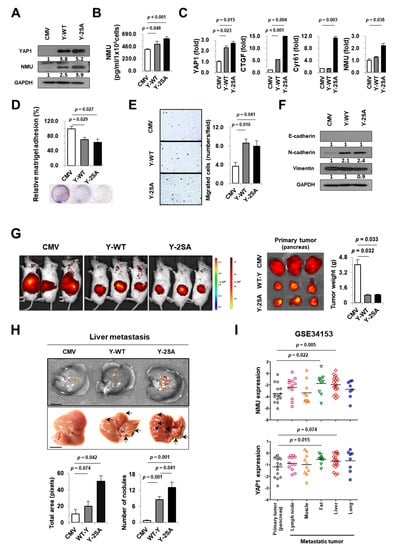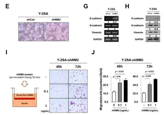 Whole cell lysates were prepared using Pro-PREP Protein Extraction Solution (iNtRON Biotechnology, Seoul, Korea). Western blot analysis was performed as previously described [52] with the following antibodies: GAPDH, YAP1 (Cell Signaling, Danvers, MA, USA), E-cadherin, N-cadherin, vimentin (Santa Cruz Biotechnology, Santa Cruz, CA, USA), and NMU (Alpha Diagnostic International, TX, USA). Original western blots data were shown in Figure S6.