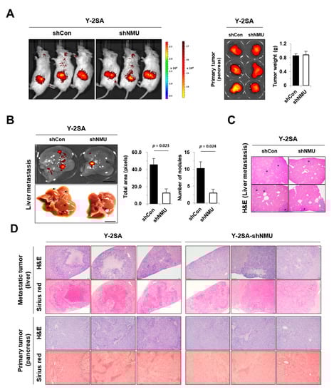 The effect of NMU inhibition in vivo was examined in Y-2SA-shNMU cells because these cells showed decreased motility and recovered MET compared with Y-2SA cells. Mice were sacrificed at 6 weeks after tumor implantation. Although there were no significant differences in primary tumor bioluminescence and weight (Figure 5A), Y-2SA-shNMU cells-injected mice had fewer metastatic liver nodules than mice injected with Y-2SA-shCON cells (Figure 5B,C). Hematoxylin and eosin (H & E) staining was used to directly observe the metastatic lesions inside the liver. Collagen accumulation in metastatic and primary tumors was lower in the Y-2SA-shNMU-injected group than in the Y-2SA-shCON-injected group (Figure 5D). Collectively, these findings indicated that NMU downregulation was responsible for the suppressive effects of YAP1-driven cell motility and metastatic properties and confirmed the results obtained by the overexpression of YAP1.