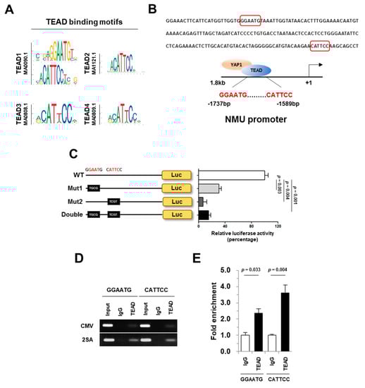 YAP1 is a transcriptional co-activator that interacts with TEAD DNA binding proteins to initiate proliferative and oncogenic activities [14,16]. Our results led us to hypothesize that NMU expression may be positively regulated by YAP1. To confirm this hypothesis, TEAD binding motifs were predicted using the JASPAR database (Figure 6A), and the analysis of the human NMU promoter region identified two potential TEAD binding elements located between base pairs −1737 and −1732 (5′-GGAATG-3′) and −1589 and −1584 (5′-CATTCC-3′) upstream of the transcription start site (+1). The cells 293FT were transfected with a NMU promoter–luciferase reporter constructs with (WT-NMU promoter, WT) or without (Mutant1-NMU promoter, Mut1; Mutant2-NMU promoter, Mut2; double-mutant-NMU promoter, Double) the putative TEAD response element (Figure 6B). The results of the reporter assay showed that mutation of the TEAD binding elements in the NMU promoter greatly decreased NMU transcriptional activity in 293FT cells (Figure 6C). To determine whether NMU is a direct transcriptional target of YAP1/TEAD, we performed a ChIP assay in 293FT cells, which confirmed the binding of TEAD to the promoter region of NMU (Figure 6D). Taken together, these results indicated that TEAD binds directly upstream of the NMU gene to regulate its transcription.