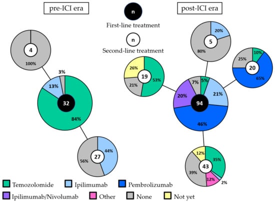 In the pre-ICI era, first-line treatment consisted of chemotherapy (temozolomide) in the majority of patients (84%: Figure 1). Four patients received ipilimumab within a clinical trial as first-line treatment. Twelve patients treated with first-line chemotherapy received ipilimumab as second-line treatment. None of the patients received anti-PD-1 antibodies.