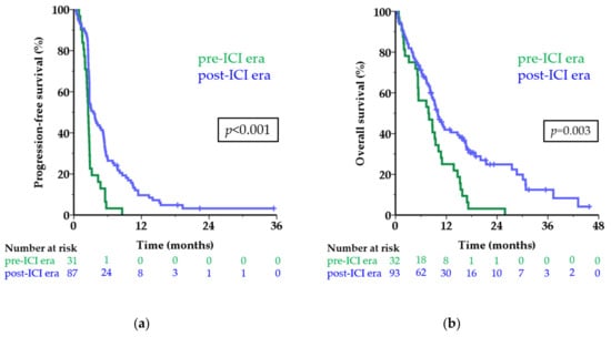 The median PFS of first-line treatment in the pre-ICI era was 2.5 months versus 3.5 months in the post-ICI era (HR 0.43; 95 CI 0.28–0.67; p < 0.001; Figure 2a). The six-month PFS rate was 3.2% and 27.6%, respectively. Among patients in the post-ICI era, 9.7% were still free of progression one year after start of treatment versus none in the pre-ICI era.