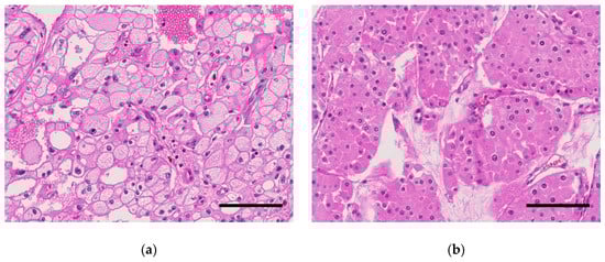 Representative microscopic images of chromophobe renal cell carcinomas (chRCCs) in the Swiss cohort (hematoxylin and eosin staining, scale bar, 100 µm). (a) classic chRCC with pale cells. (b) eosinophilic chRCC without pale cells.
