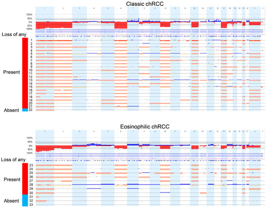 Copy number (CN) alterations and copy-neutral loss-of-heterozygosity detected by Affymetrix OncoScan® CNV Assay of 22 classic chromophobe renal cell carcinomas (chRCCs) (upper panel) and 11 eosinophilic chRCCs (lower panel) in the Swiss cohort. Red signal, blue signal, and yellow signal show copy-number loss, copy-number gain, and copy-neutral loss-of-heterozygosity, respectively. Loss of any: Loss of any chromosome among chromosome 2, 6, 10, 13, 17, or 21. Red: Present, Blue: Absent.