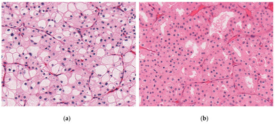 Representative microscopic images of chromophobe renal cell carcinomas (chRCCs) in the Cancer Genome Atlas Kidney Chromophobe (TCGA-KICH) cohort, whole-slide images from the Cancer Digital Slide Archive [21] (a) classic chRCC with pale cells (TCGA-KL-8345). (b) eosinophilic chRCC without pale cells (TCGA-KL-8326).