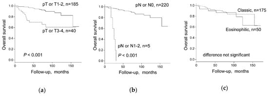 Higher pT stage (pT3–4 vs. pT1–2) and higher pN stage (pN1–2 vs. pN0) were significantly associated with worse survival by log-rank test (Figure 4a,b) and univariate Cox regression analysis (Table 3) in the Swiss-TCGA-Japanese cohort. There was no overall survival (OS) difference between classic and eosinophilic chRCC subtypes in the three independent cohorts of the Swiss (42 cases), TCGA-KICH (64 cases) and the Japanese (119 cases) nor in the Swiss-TCGA-Japanese combined cohort (Figure 4c). Multivariate Cox regression analysis, including pT stage (pT3–4 vs. pT1–2), pN stage (pN1–2 vs. pN0), WHO/ISUP grade (Grade 3/4 vs. Grade 2), and chRCC subtype showed that pT stage and pN stage were independent prognostic factors for OS, whereas no prognostic impact of the chRCC subtype or WHO/International Society of Urological Pathology (ISUP) grade was observed (Table 3).