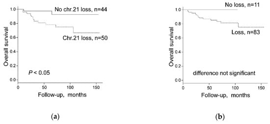 Overall survival stratified by (a) chromosome 21 status (Chr.21 loss versus No chr.21 loss) and (b) Loss of any chromosome among chromosome 1, 2, 6, 10, 13, 17, or 21 (Loss versus No loss) in 94 chRCC patients combined from Swiss and the Cancer Genome Atlas Kidney Chromophobe (TCGA-KICH) cohorts.