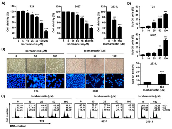 The inhibition of cell viability and induction of cell cycle arrest at gap 2/ mitosis (G2/M) phase using isorhamnetin in bladder cancer cells. T24, 5637, and 2531J cells were treated with the indicated concentrations of isorhamnetin for 48 h. (A) The cell viability was assessed using 3-(4,5-dimethyl-2-thiazolyl)-2,5-diphenyltetra-zolium bromide (MTT) assay. Each bar represents the mean ± standard deviation (SD) of three independent experiments (* p < 0.05 and *** p < 0.0001 compared to the control). (B, Upper panel) Morphological changes of T24 and 5637 cells were observed using phase-contrast microscopy. (B, Lower panel) The 4′,6-diamidino-2-phenylindole (DAPI)-stained nuclei were pictured under a fluorescence microscope. Representative photographs of the morphological changes are presented. (C,D) The cells were stained with propidium iodide (PI) solution for flow cytometry analysis. Quantification of the cell population (in percent) in different cell cycle phases of viable cells is shown. (D) Sub-G 1% was calculated as the percentage of the number of cells in the sub-G1 population relative to the number of total cells. Data were expressed as the mean ± SD of three independent experiments (* p < 0.05, ** p < 0.001, and *** p < 0.0001 compared to the control).