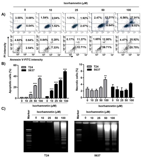 To examine the mechanism responsible for the isorhamnetin-induced anti-proliferative effect, the cell cycle distribution profile was examined. Flow cytometry data demonstrated that the percentage of cells arrested at G2/M phase was increased with increasing isorhamnetin treatment concentration, coupled with a decrease in the proportion of cells in the G1 and S phases (Figure 1C). Meanwhile, a significant increase of the cells in the sub-G1 phase, which was used as an index of apoptotic cells, was observed in isorhamnetin-treated cells (Figure 1D). Therefore, 4′,6-diamidino-2-phenylindole (DAPI) staining was performed to investigate whether apoptosis was involved in cell the growth inhibition induced by isorhamnetin. Figure 1B (lower panel) indicates that morphological changes of the nuclei, which were observed in apoptosis-inducing cells, such as nuclear fragmentation and chromatin condensation, were dominantly found in isorhamnetin-treated T24 and 5637 cells. Since 2531J cells also had the same results, the following experiments were performed on T24 and 5637 cells. To quantify the apoptosis triggered by isorhamnetin, an annexin V-fluorescein isothiocyanate (FITC)/propidium iodide (PI) double staining assay was conducted. As indicated in Figure 2A,B, after treatment with isorhamnetin, the populations of annexin V-staining positive cells were significantly increased, as compared to the control. On the other hand, T24 cells showed slightly increase in necrotic death upon 100 μM of isorhamnetin, but not 5637 cells (Figure 2B). Consistent with this, the results from agarose gel electrophoresis showed that as the isorhamnetin concentration increased and more fragmented DNA was observed (Figure 2C), indicating that an isorhamnetin-induced G2/M phase arrest was associated with the induction of apoptosis.