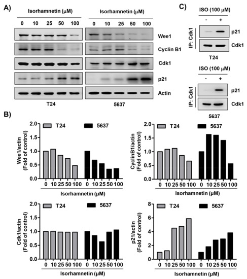 To explore the biochemical event of the isorhamnetin-elicited cell cycle arrest, the levels of G2/M phase-associated proteins were analyzed. The immunoblotting results revealed that following isorhamnetin treatment, the levels of Wee1 and cyclin B1 were reduced, and the effect was concentration-dependent, while the expression of cyclin-dependent kinase (Cdk) 1 (also called cell division cycle 2, Cdc2) was maintained at the level of the control group (Figure 3A,B). However, the expression of Cdk inhibitor p21WAF1/CIP1 was markedly increased in response to isorhamnetin exposure. Next, we performed co-immunoprecipitation to investigate the role of isorhamnetin-induced p21, and found that this increased p21 via treatment with isorhamnetin complexed with Cdk1 (Figure 3C). These results suggest that increased p21 protein in isorhamnetin-treated cells contributed to G2/M phase arrest by inhibiting its activity through binding to Cdk1.