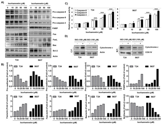 Modulation of apoptosis-regulatory factors using isorhamnetin in bladder cancer cells. (A) After treatment with isorhamnetin for 48 h, Western blotting was performed using the indicated antibodies and an ECL detection system. Actin was used as an internal control. (B) The expression of each protein was indicated as a fold change relative to the control. Quantitative analysis of mean pixel density was performed using the ImageJ® software. (C) The activities of caspases were evaluated using caspase colorimetric assay kits. The data were expressed as the mean ± SD of three independent experiments (* p < 0.05, ** p < 0.001, and *** p < 0.0001 compared to the control). (D) After treatment without or with 100 μM isorhamnetin for 48 h, cytosolic and mitochondrial proteins were prepared and analyzed for cytochrome c expression using Western blot analysis. Equal protein loading was confirmed via the analysis of actin and cytochrome oxidase subunit VI (COX VI) in each protein extract (C.F.—cytosolic fraction; M.F.—mitochondrial fraction).
