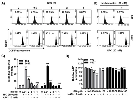 Accumulation of reactive oxygen species (ROS) and decrease of ATP content using isorhamnetin in bladder cancer cells. (A) Cells were treated with 100 μM isorhamnetin for the indicated times. (B) The cells were pre-treated with or without 10 mM N-acetyl-L-cysteine (NAC) for 1 h before isorhamnetin treatment for 1 h. (A,B) The medium was discarded and the cells were incubated for 20 min with medium containing 5,6-carboxy-2′,7′-dichlorodihydrofluorescein diacetate (DCF-DA). ROS generation was measured using flow cytometry. (C) Each bar represents the mean ± SD of three independent experiments. (D) After treatment with the indicated concentrations of isorhamnetin in the presence or absence of NAC, the content of intracellular ATP was measured. Each point represents the mean ± SD of three independent experiments (* p < 0.05, ** p < 0.001, and *** p < 0.0001 compared to control; ## p <0.001 and ### p < 0.0001 compared to isorhamnetin-treated cells). ISO—isorhamnetin.
