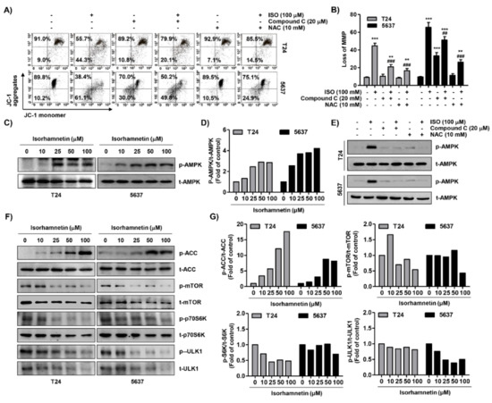 We assessed the level of MMP to investigate whether the inhibition of ROS-dependent ATP production by isorhamnetin was associated with impaired mitochondrial function. According to the results of flow cytometry using 5,5′,6,6′-tetrachloro-1,1′,3,3′-tetraethylimidacarbocyanine iodide (JC-1) dyes, the formation of JC-1 aggregates in mitochondria was maintained at a relatively high rate in cells not treated with isorhamnetin, while the ratio of JC-1 monomers increased with increasing isorhamnetin treatment concentration, indicating a remarkable depletion of MMP after isorhamnetin treatment (Figure 6A,B). Furthermore, isorhamnetin increased the phosphorylated level of AMPK, as well as its downstream factor acetyl-CoA carboxylase (ACC) (Figure 6C,F), indicating that the AMPK signaling pathway was activated as a result of the loss of ATP. Additionally, we evaluated the effects of isorhamnetin on the phosphorylation of the mechanistic target of rapamycin (mTOR), p70S6K, and Unc-51-like kinase (ULK1), which are AMPK downstream molecules that regulate cell proliferation, apoptosis, and autophagy [36]. Exposure of T24 and 5637 cells with isorhamnetin led to down-regulation in the phosphorylation of mTOR and p76S6K in a dose-dependent manner (Figure 6F,G). Interestingly, we found the isorhamnetin inhibited autophagy via down-regulation of the expression and phosphorylation of ULK1. In addition, our supplementary result showed that the expression of autophagy-related markers was down-regulated using the isorhamnetin treatment, similar to ULK1 (Supplementary Figure S1). However, the presence of NAC or compound C, an antagonist of AMPK, significantly prevented the isorhamnetin-induced loss of MMP (Figure 6A,B), and NAC or compound C also markedly abolished enhanced activation of the AMPK signaling by isorhamnetin (Figure 6E). These data indicate that isorhamnetin-promoted mitochondrial dysfunction associated with the disturbance of ATP production was mediated through an ROS-dependent pathway.