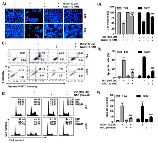 Roles of ROS in isorhamnetin-induced apoptosis and cell cycle arrest in bladder cancer cells. Cells were either treated with 100 μg/mL isorhamnetin for 48 h or pre-treated with 10 mM NAC for 1 h before isorhamnetin treatment, and were then collected. (A) The DAPI-stained nuclei were pictured under a fluorescence microscope. (B,C) The cells were stained with annexin V-FITC and PI for flow cytometry analysis. (B) Representative profiles. The results show early apoptosis, defined as annexin V+ and PI− cells (lower right quadrant), and late apoptosis, defined as annexin V+ and PI+ (upper right quadrant) cells. (C) The percentages of apoptotic cells were determined by expressing the numbers of Annexin V+ cells as percentages of all the present cells. (D) The cells were stained with PI solution for flow cytometry analysis. Quantification of the cell population (in percent) in different cell cycle phases of viable cells is shown. (E) The percentages of apoptotic sub-G1 were calculated as the percentage of the number of cells in the sub-G1 population relative to the number of total cells. (F) The cell viability was assessed using an MTT assay. Each bar represents the mean ± SD of three independent experiments (*** p < 0.0001 compared to the control; ### p < 0.0001 compared to the isorhamnetin-treated cells).