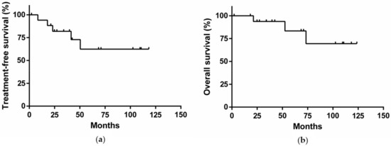 (a) Treatment-free survival of the cohort; (b) Overall survival of the cohort.