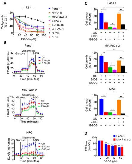 Given that alterations in cancer cell metabolism can lead to an inhibition of cell growth [16], and because EGCG has been shown to affect glycolysis in other tumor types [11,12,13], we evaluated the effect of EGCG on glucose metabolism in two human pancreatic cancer cells and one murine pancreatic cancer cell line (KPC). We assessed the impact of EGCG on glycolysis by measuring the extracellular acidification rate (ECAR) in the MIA PaCa-2, Panc-1, and KPC cell lines. After 24 h of treatment, EGCG strongly reduced ECAR in all three cell lines, revealing an inhibitory effect of EGCG on glycolysis (Figure 1B and Figure S1).