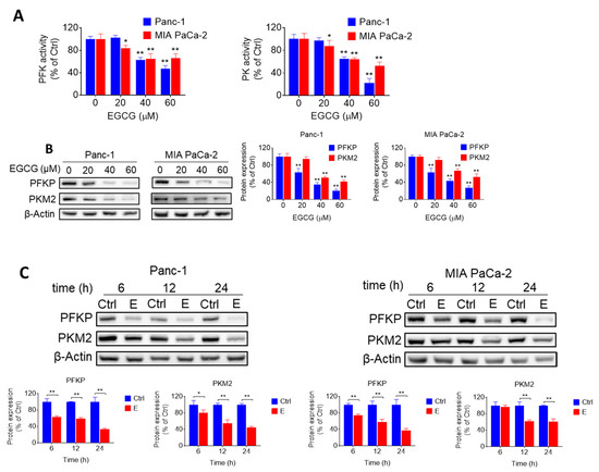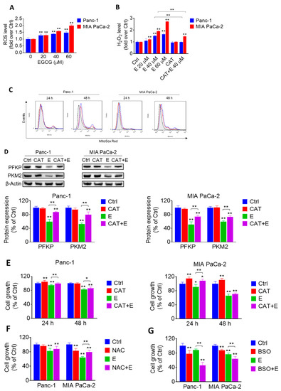 To elucidate whether the effect of EGCG on glycolysis is mediated through the increase in ROS, Panc-1 and MIA PaCa-2 cells were incubated with or without EGCG at 40 µM in the presence or absence of catalase for 12 h. In both cell lines, catalase mostly abrogated the inhibitory effect of EGCG on PFKP and PKM2, suggesting that the effect of EGCG on glycolytic enzymes is dependent on the ability of EGCG to induce ROS (Figure 3D, Figure S7).