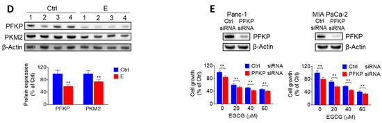 To confirm the role of PFKP on EGCG-induced cell growth inhibition, we silenced PFKP in Panc-1 and MIA PaCa-2 cells. Knocking-down PFKP reduced Panc-1 and MIA PaCa-2 cell growth by 15% and 19%, respectively. In Panc-1 and MIA PaCa-2 cells transfected with nonspecific siRNA, EGCG 40 μM decreased the number of viable cells by 49% and 42%, whereas in PFKP-silenced cells, EGCG reduced cell growth by 57% and 54% in Panc-1 and MIA PaCa-2 cells, respectively (Figure 2E, Figure S6). Taken together, these findings indicate that silencing PFKP function has a slight additive effect on the growth inhibitory response of EGCG in both cell lines, and suggest that regulating glycolysis represents an important mechanism of EGCG in inhibiting pancreatic cancer cell growth.