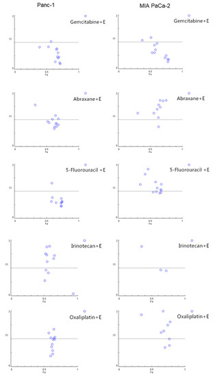 Because chemotherapeutics often display limited effects, show resistance, and cause side-effects, we evaluated whether EGCG would represent a useful partner in combination with commonly used drugs. For this purpose, we treated Panc-1 and MIA PaCa-2 cells with EGCG alone or in combination with gemcitabine, Abraxane®, 5-Fluorouracil, irinotecan, or oxaliplatin, five commonly used chemotherapeutics in pancreatic cancer patients, for 72 h and analyzed their combination index (CI) by means of the Chou–Talalay method. In both Panc-1 and MIA PaCa-2 cells, EGCG strongly synergized with gemcitabine (Figure 4 and Table S1). For example, in Panc-1 cells, the CI of all tested groups, except one, showed synergistic effects. In MIA PaCa-2 cells, the CI effects between EGCG and gemcitabine were also indicative of a strong additive effect (Figure 4). The combination effect of EGCG with the other four chemotherapeutics tested presented effects that were more variable with some showing an additive effect (Figure 4 and Table S1).
