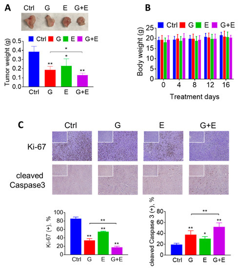 EGCG enhances the anticancer effect of gemcitabine in pancreatic cancer xenografts. (A) EGCG (E) promoted tumor weight lost with gemcitabine (G). Results are presented as the mean ± SD. * p < 0.05, ** p < 0.01 vs. control. (B) Mice body weight during treatment days for control, gemcitabine-treated groups (G), EGCG-treated groups (E), and the combination (G + E). Results are presented as the mean ± SD. (C) Immunostaining of the cell proliferation marker Ki-67 and of cleaved Caspase 3 were performed on KPC tumor sections and photographs were taken at 100× magnification. Representative images are shown. The consecutive section was stained with isotype Immunoglobulin G (IgG) as negative staining control and it is shown in the upper left corner. Results were expressed as percent of positive (+) cells ± SD per 100x field. * p < 0.05, ** p < 0.01 vs. control.